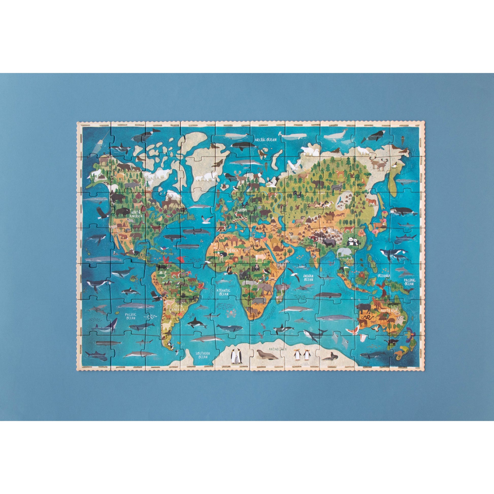 Formato único: Piezas de cartón de alta calidad con formas irregulares que representan océanos, montañas y selvas.
