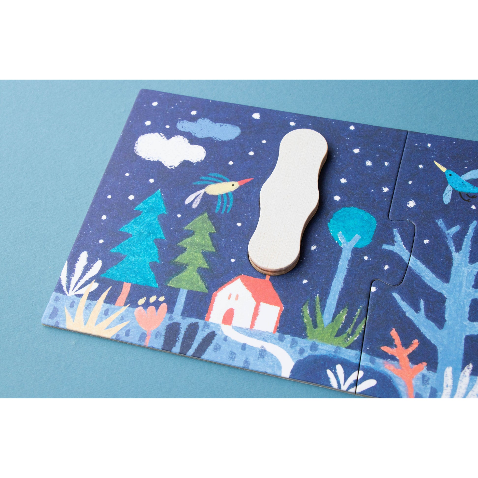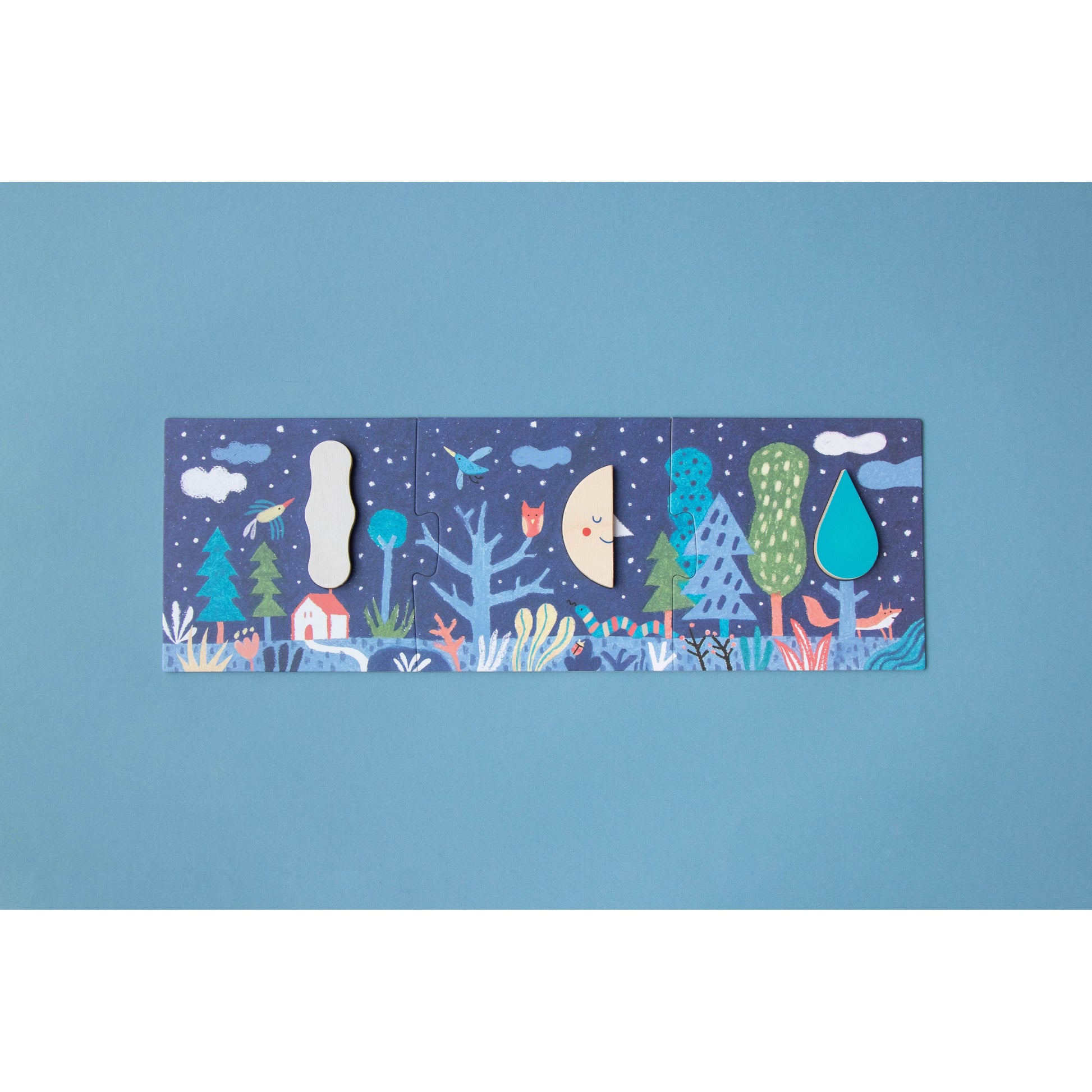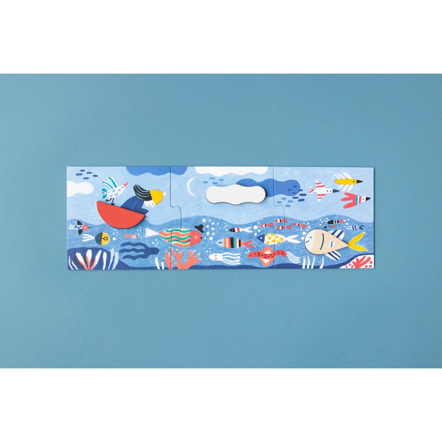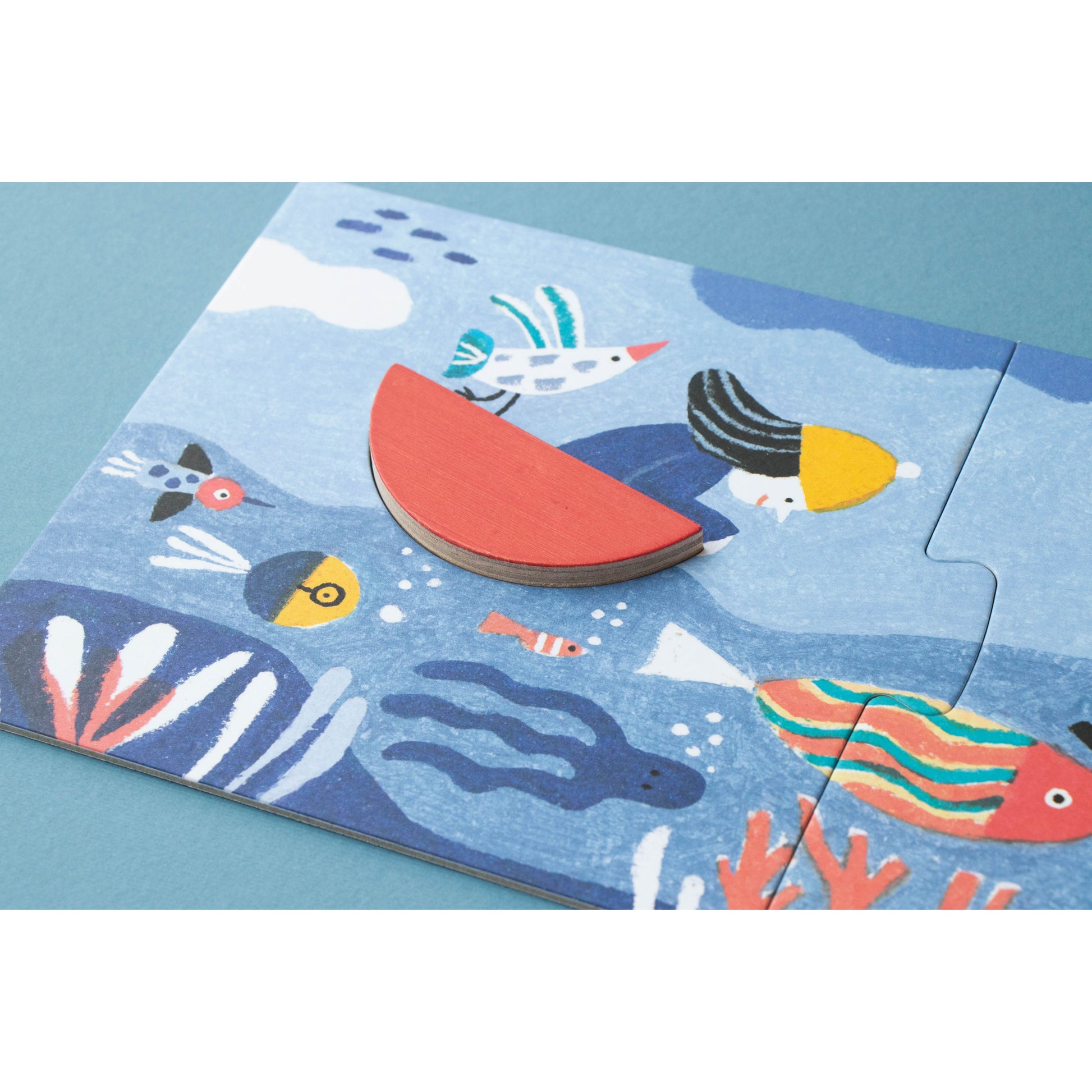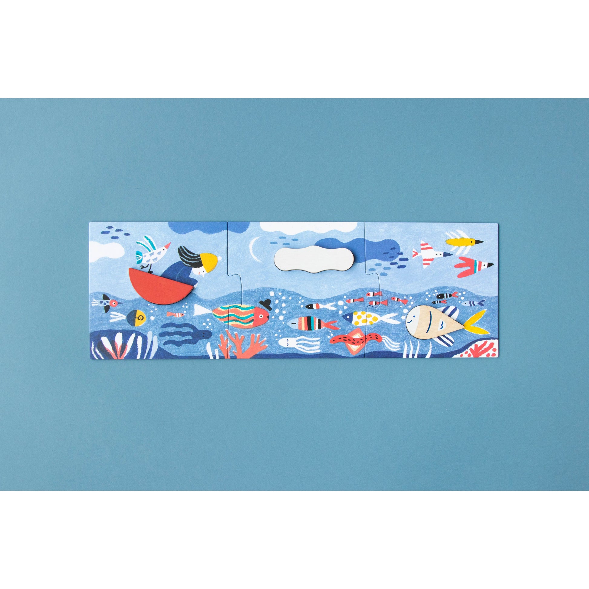 Imagine es un mini-puzzle multipropósito formado por 3 puzles de 3 piezas cada uno, que se encajan en la tapa magnética de su cajita de madera. Una vez montadas, las figuras (barco, pez y nube) se desprenden para jugar libremente e inspirar infinitas aventuras: navegaciones, exploraciones submarinas o viajes por el cielo.