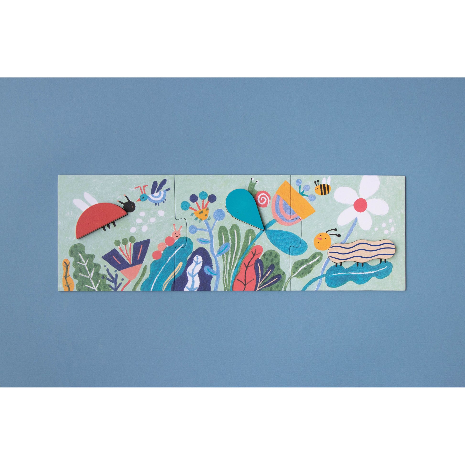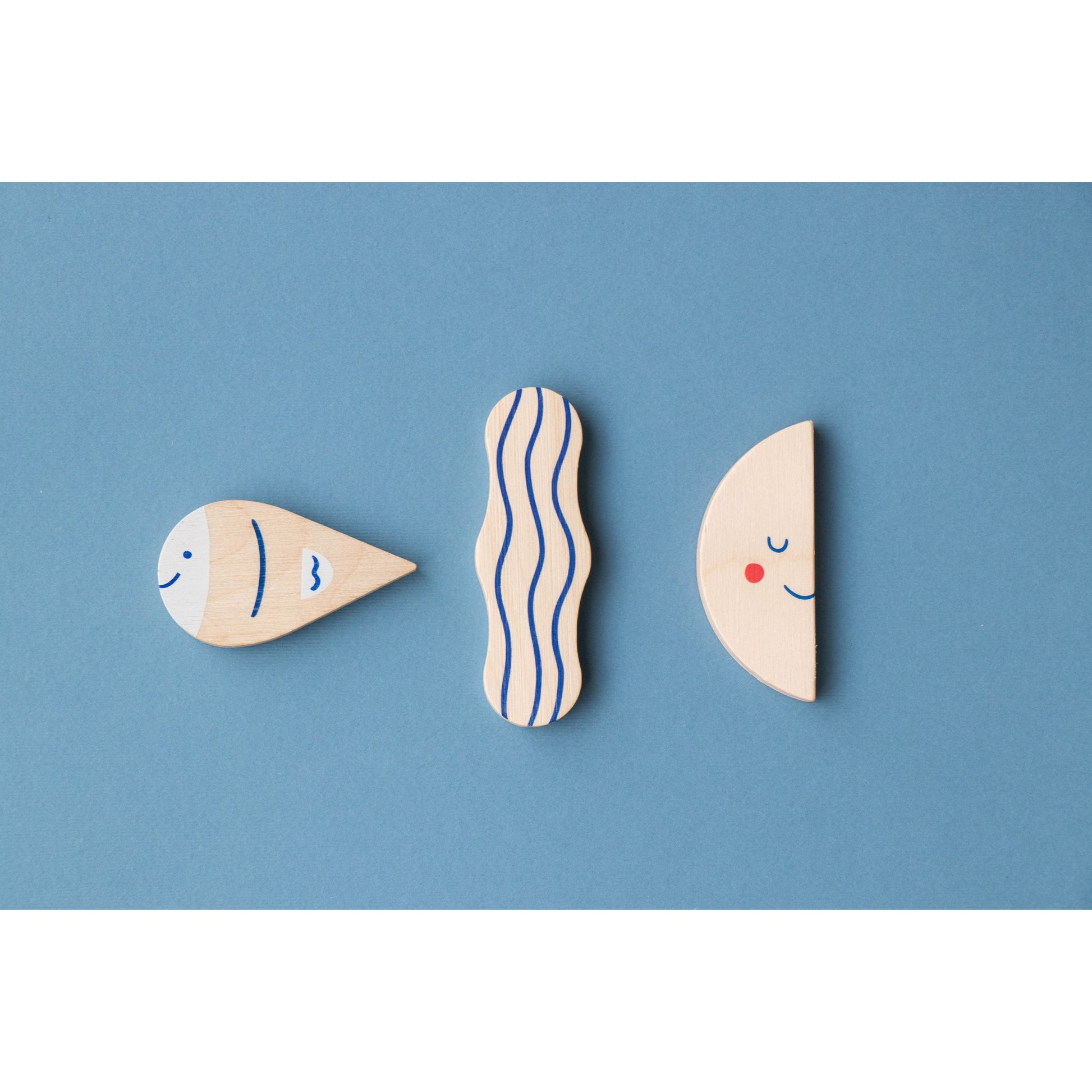 3 puzzles insertables: Barco, pez y nube, cada uno en 3 piezas de tamaños progresivos.