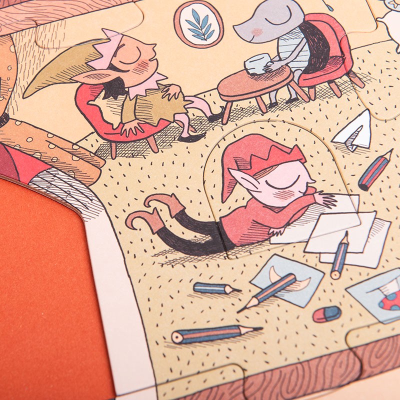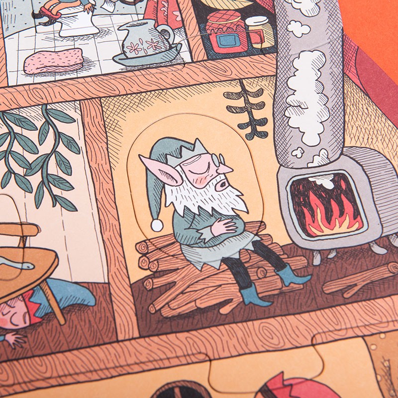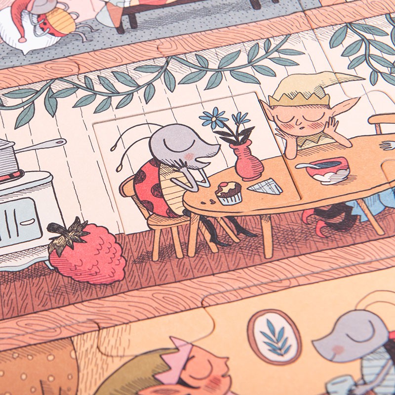 ¡Shhh… ha llegado el hada del sueño a la casa de los duendes! Es hora de apagar la luz y descansar. En este puzzle reversible y de encajar, los peques podrán montar la casa seta y luego colocar las piezas dentro, acompañando a cada personaje en su momento de ir a dormir.