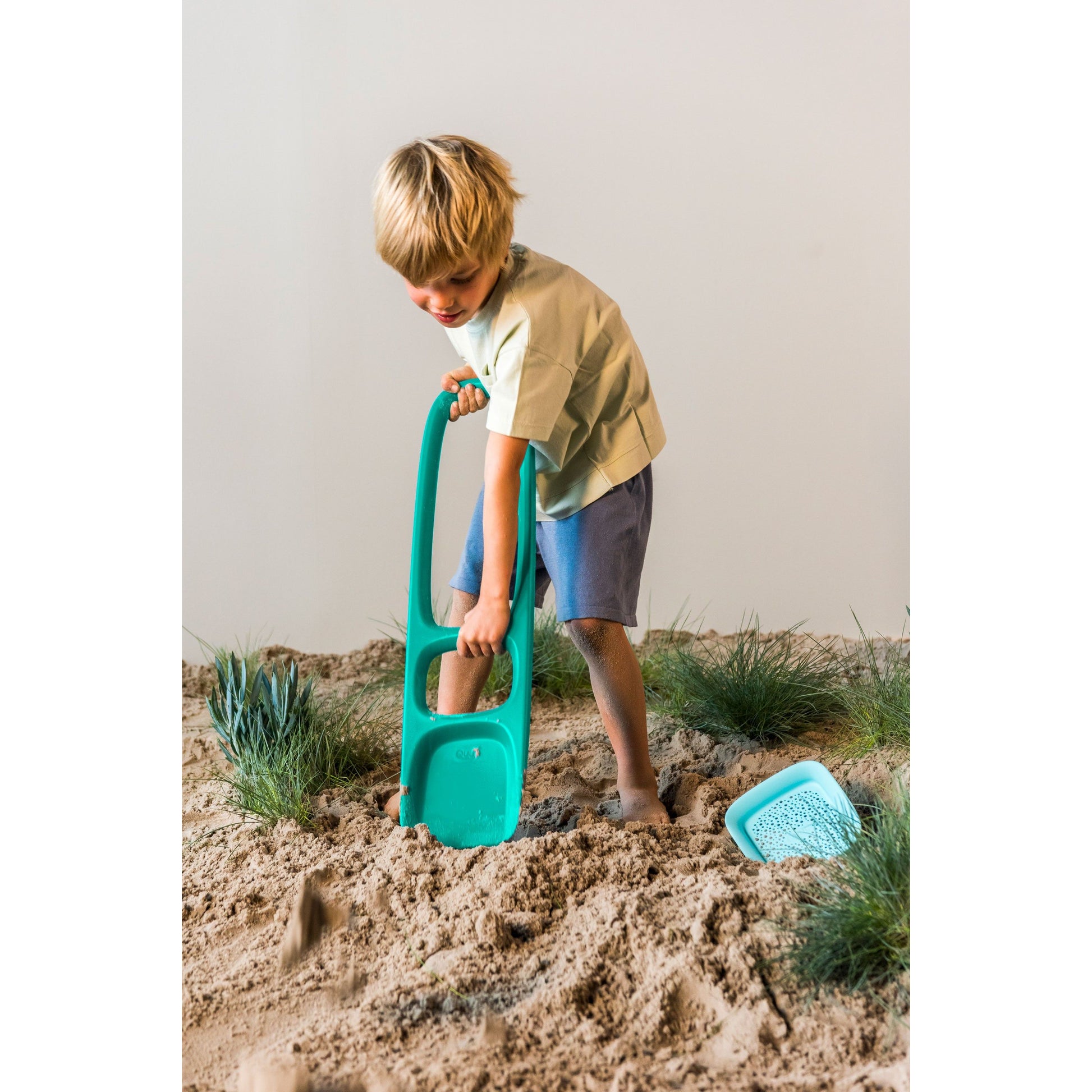 La Scoppi combina dos utensilios en uno para maximizar la diversión en la arena o el agua: un extremo actúa como pala/scoop y el otro como colador fino. Su diseño ergonómico y el acabado soft-touch facilitan a los peques excavar, recoger arena o agua, y tamizar, todo con un solo juego de manos.