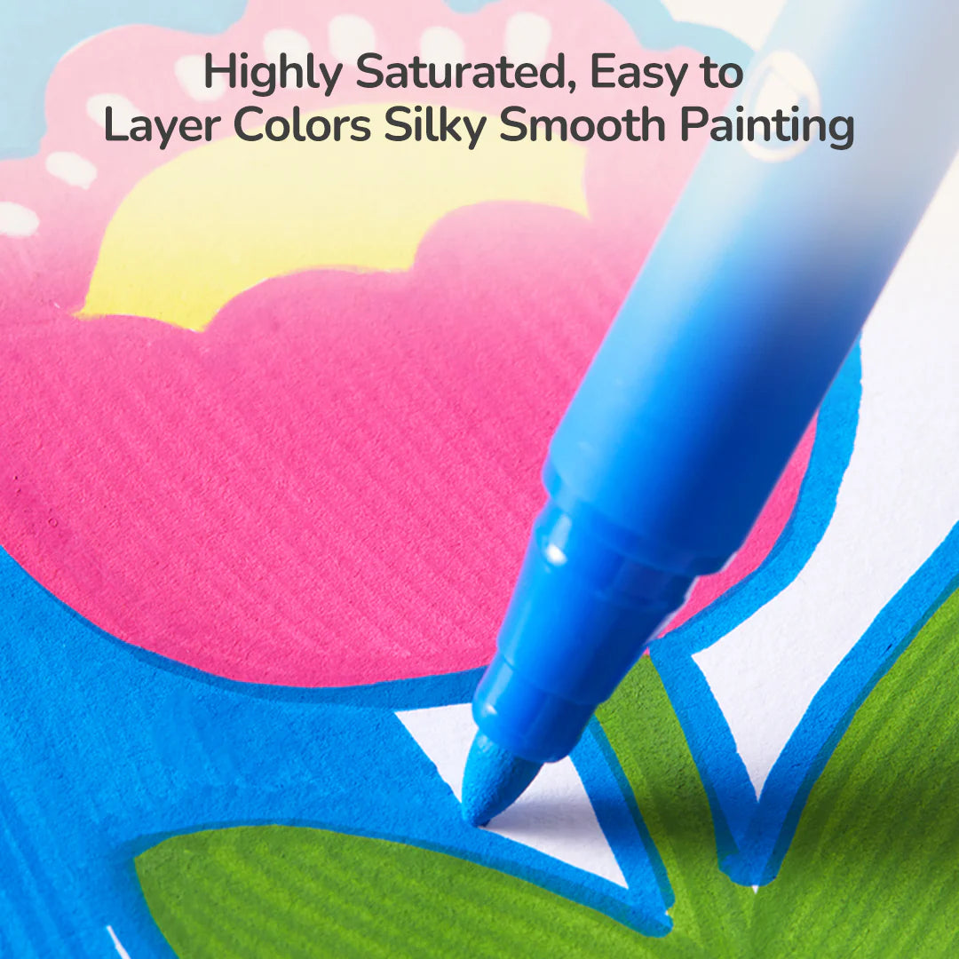 Un set artístico versátil que despierta la creatividad y la exploración sensorial en los peques: 36 rotuladores de punta de pincel ultra suave con tinta acrílica de base acuosa, sin alcohol ni olor, que ofrecen una experiencia de dibujo fluida y vibrante sobre múltiples superficies. Se presentan en un práctico estuche blando tipo bolsa de mano, ideal para llevar a clase, al cole o de viaje, fomentando el juego libres con manchas controlables y limpieza fácil.36
