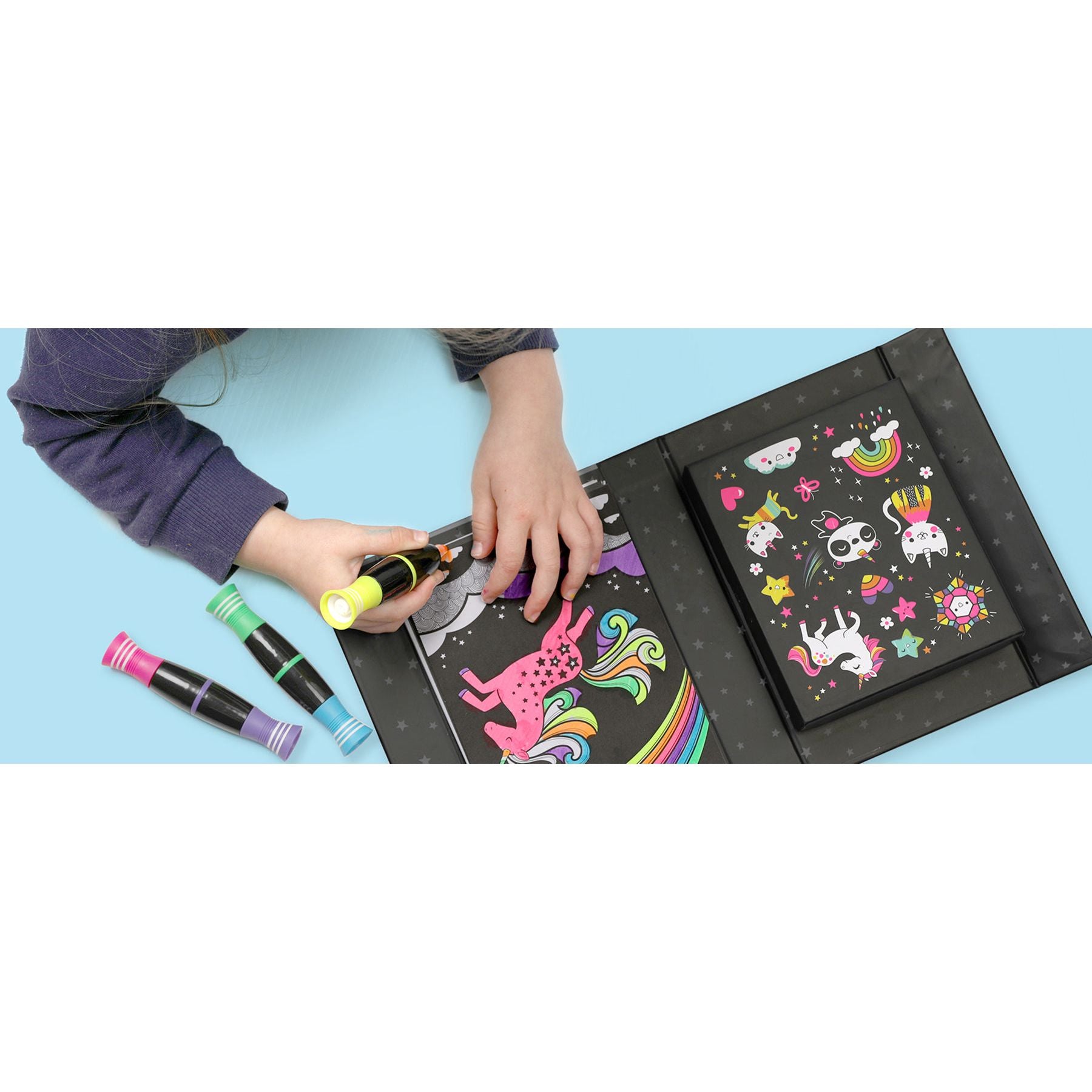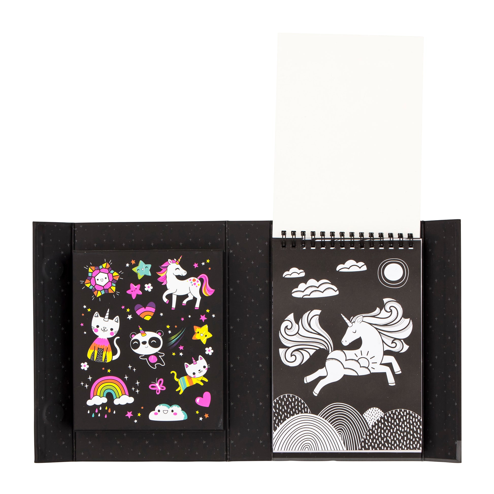 Sumérgete en un mundo mágico con este set portátil de Tiger Tribe dedicado a unicornios, gatitos alados y estrellas sonrientes. La caja con cierre magnético alberga un bloc de 36 páginas para colorear, marcadores de tinta neón doble punta y láminas de pegatinas brillantes, todo pensado para crear arte luminoso sin pantallas.