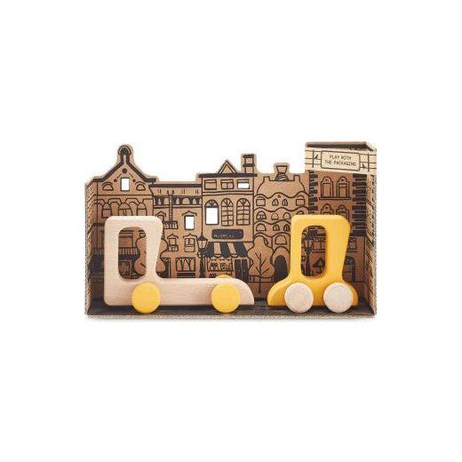 Disfruta del clásico juego de vehículos con este set artesanal de Me & Mine. Incluye un coche y un camión ensamblados en madera de haya certificada FSC, pintados a mano con pintura ecológica y presentados en un packaging de cartón que se integra al juego como decorado de ciudad o garaje.