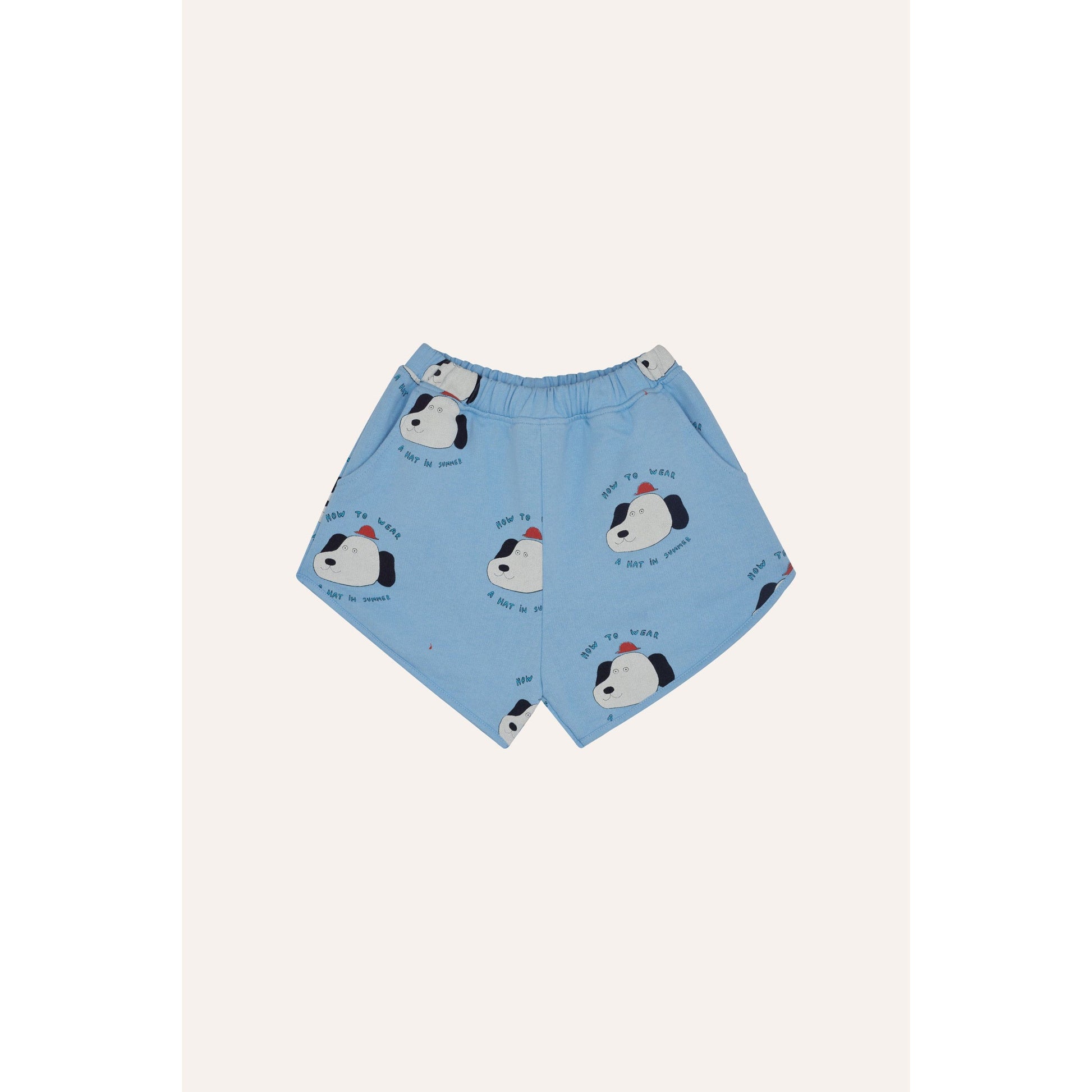 Estos shorts de algodón orgánico reúnen comodidad y diversión en un sólo diseño. Su estampado integral “How to Wear a Hat” reproduce divertidas cabecitas de perrito sobre un fondo azul cielo, perfecto para dar un toque naïf y alegre a cualquier look de verano.