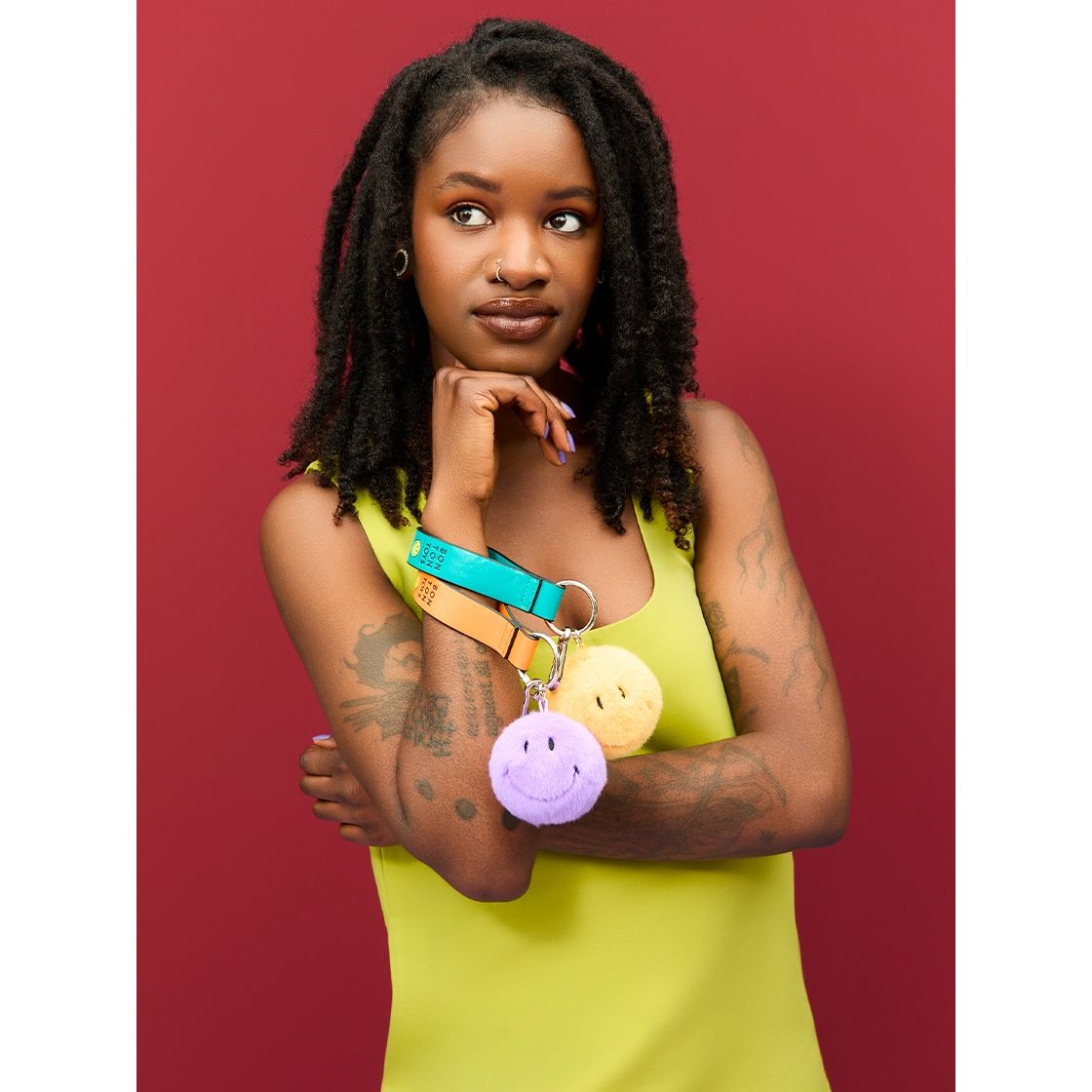 • Llavero de peluche Smiley en tono amarillo brillante.