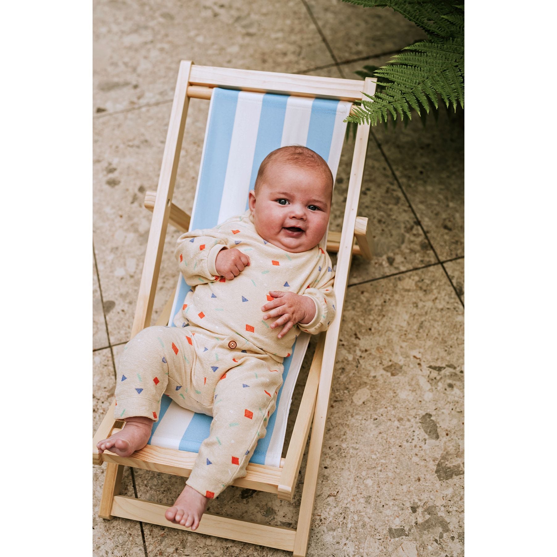 Sudadera de bebé en tono sésamo con estampado Sprinkle de pequeñas formas geométricas en colores suaves. Su diseño cómodo y desenfadado la convierte en una prenda ideal para el día a día, aportando un toque alegre y muy fácil de combinar.