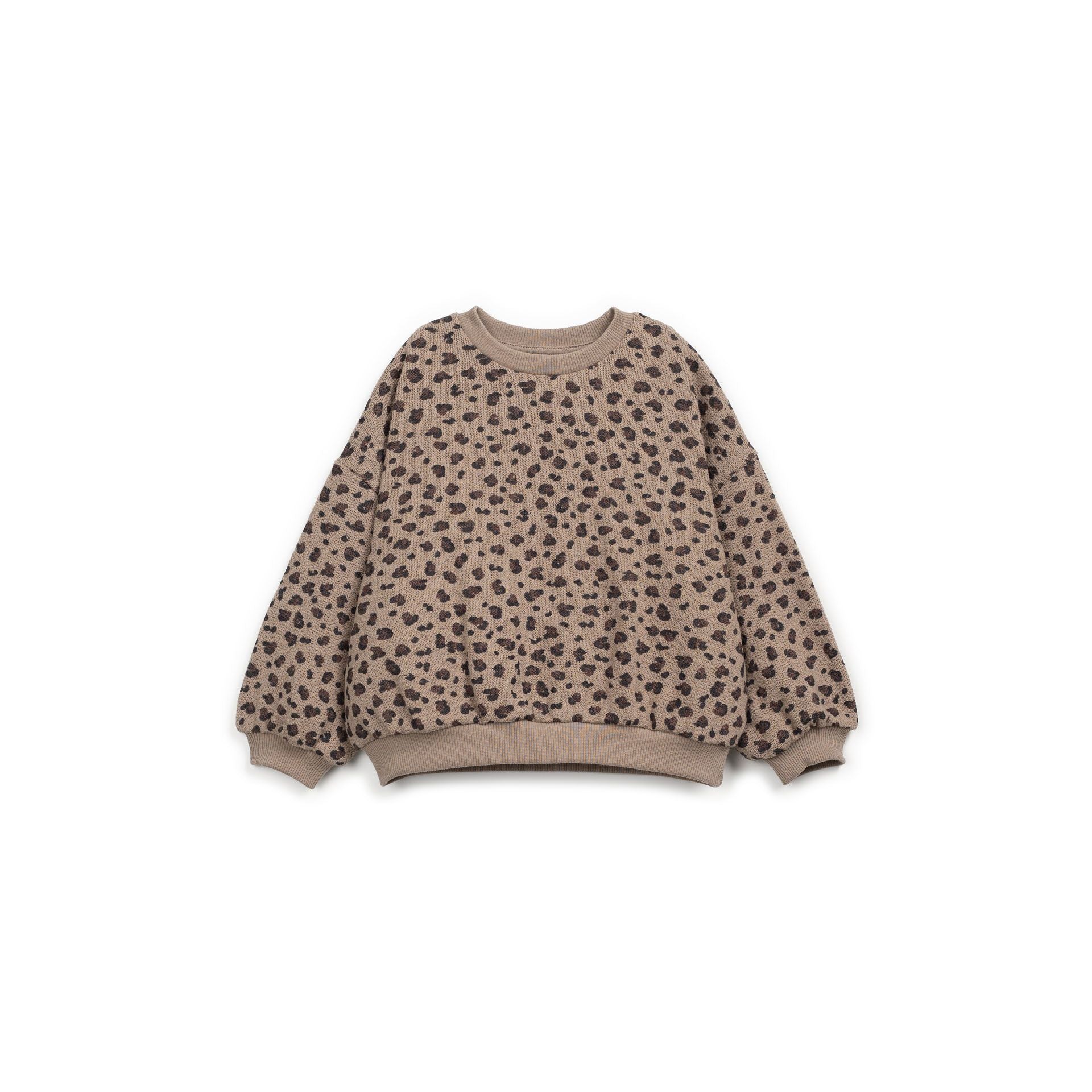 Una prenda divertida y cálida con espíritu salvaje. Esta sudadera de felpa con estampado integral de leopardo en tonos topo y negro es perfecta para aportar un toque de aventura a los días fríos. Su diseño cómodo y holgado permite moverse con libertad, y sus materiales respetuosos cuidan la piel de los más pequeños.