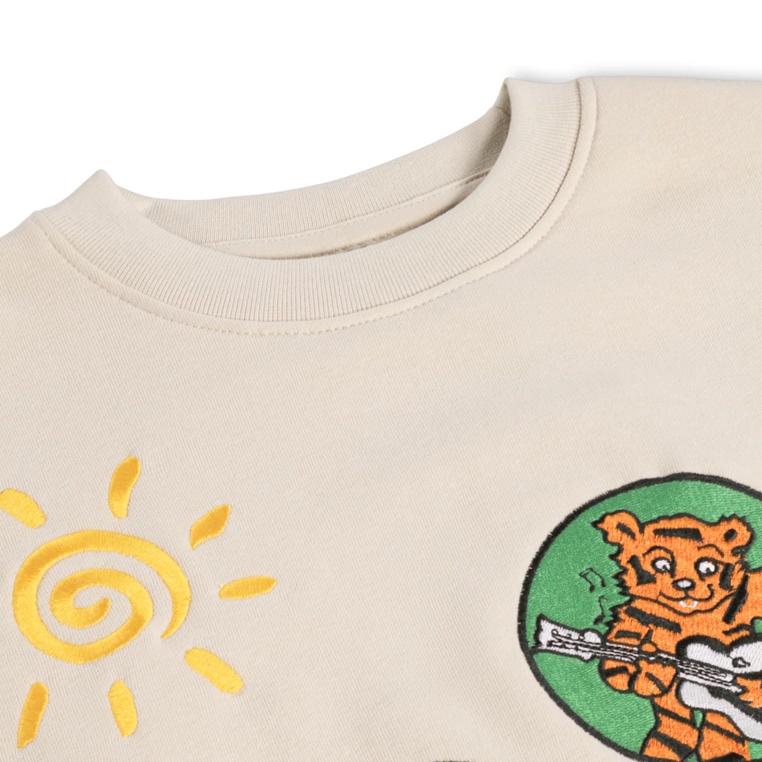 La sudadera Mar Patch Party de MOLO es una explosión de mensajes positivos y símbolos que invitan a mirar, imaginar y conversar. Su diseño tipo “parches” bordados y aplicados combina iconos de paz, naturaleza, música y optimismo sobre una base neutra fácil de combinar.