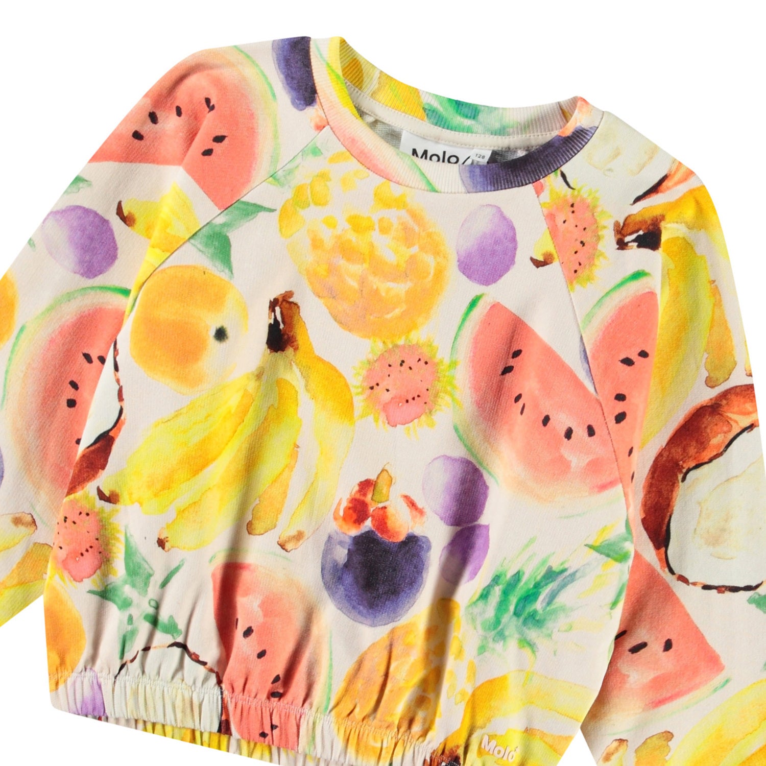Una sudadera ligera de algodón orgánico, estampada “all‐over” con frutas en acuarela: sandías, plátanos, piñas, cocos y ciruelas se combinan en un diseño fresco y vibrante. Ideal para aportar un toque veraniego a cualquier look infantil.
