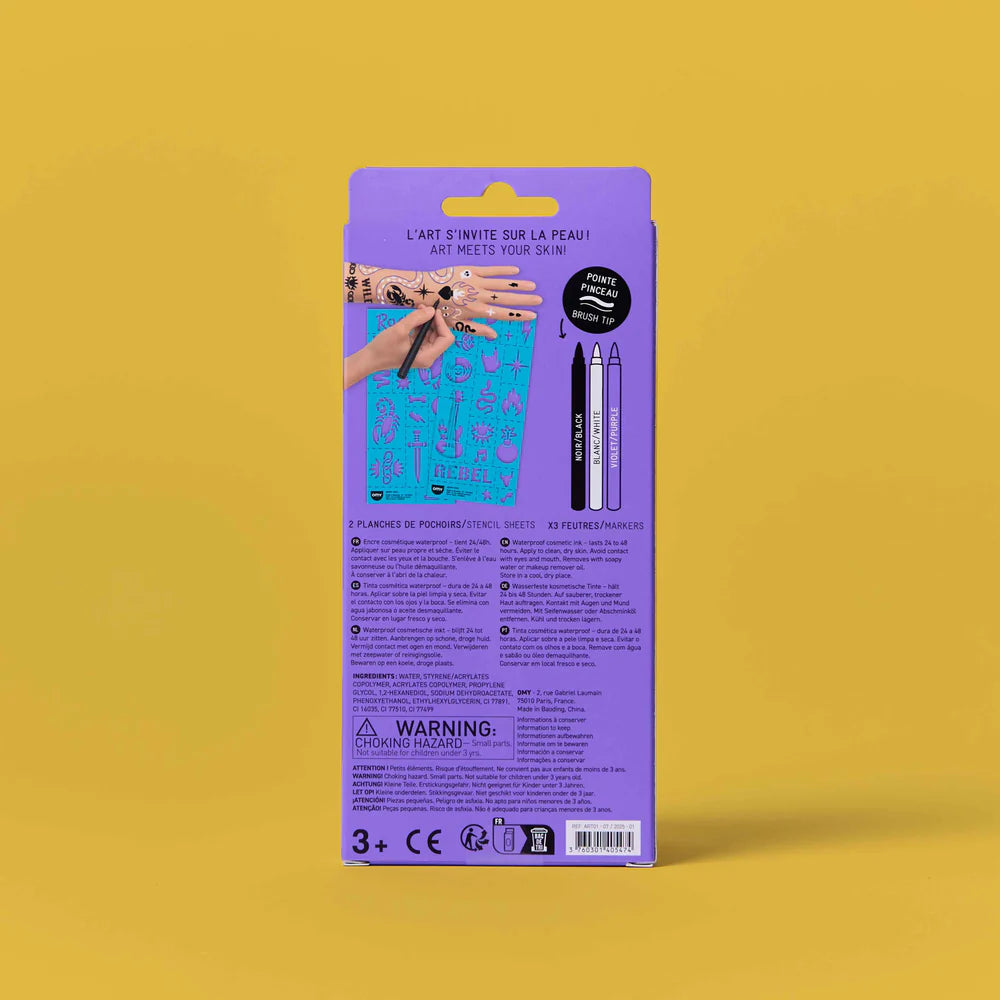 El set Tattoo Art Rock Club de OMY es una invitación a expresarse sin límites. Un kit de tatuajes temporales de estilo rockero que permite crear diseños únicos sobre la piel gracias a sus rotuladores cosméticos y plantillas reutilizables.