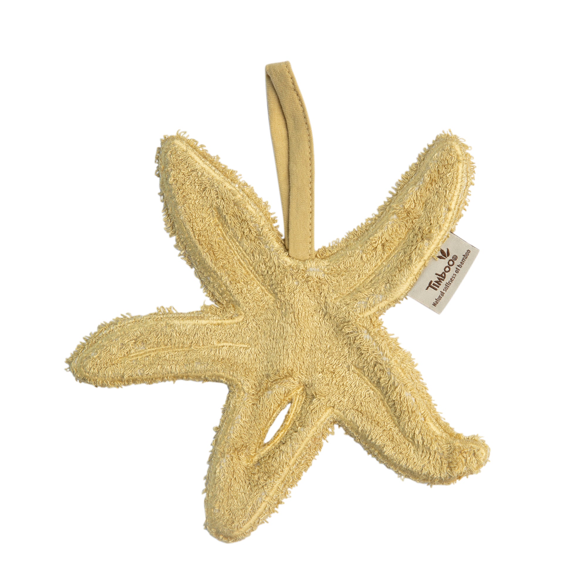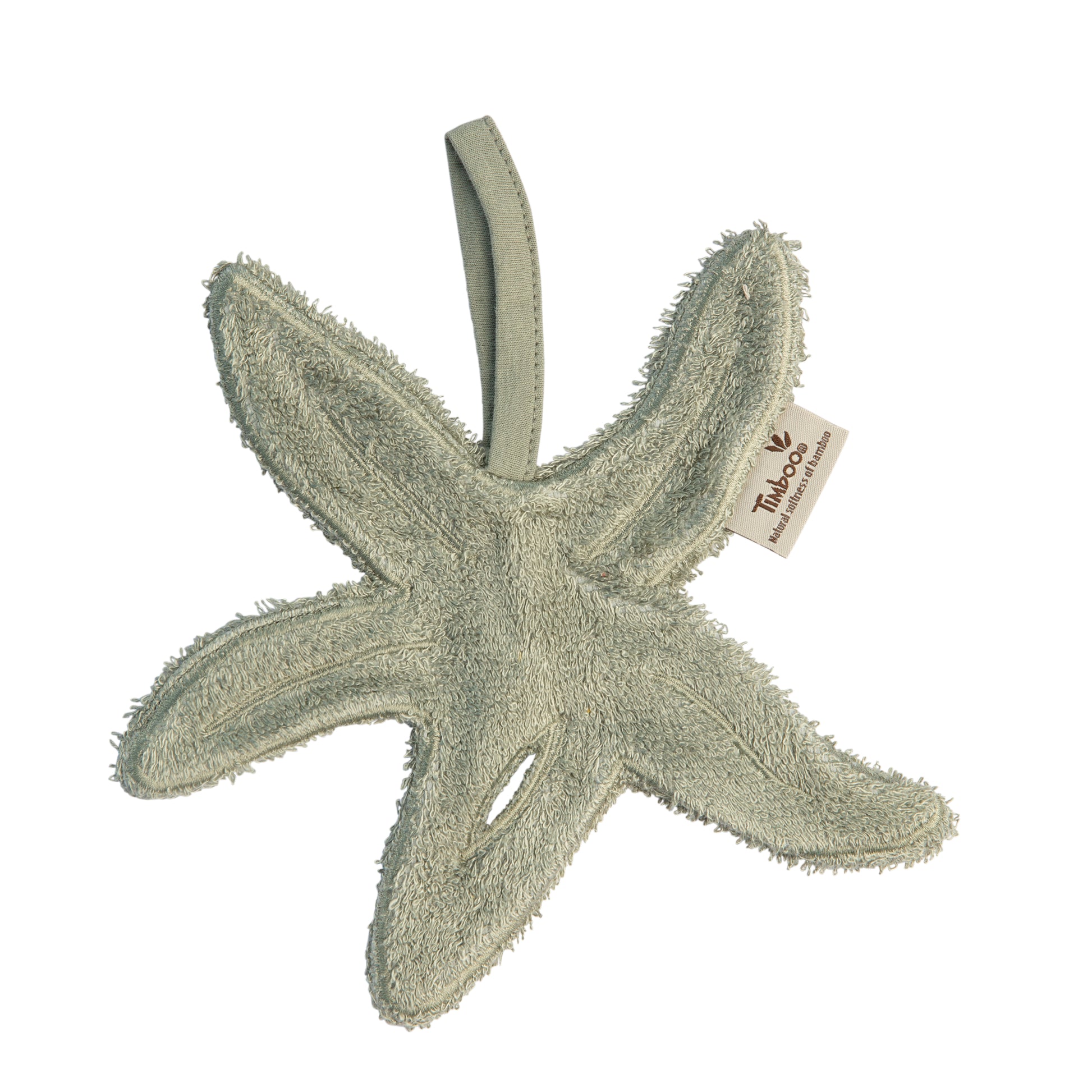 Un chupetero de tacto suave y absorbente con forma de estrella de mar, ideal para mantener el chupete limpio y siempre a mano. Con un lazo de tela resistente, se engancha fácilmente al carrito o a la mochila.