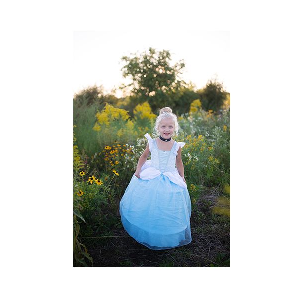 Un vestido de cuento con detalles bordados y el clásico azul de Cenicienta para transformar cualquier juego en una noche mágica de baile.