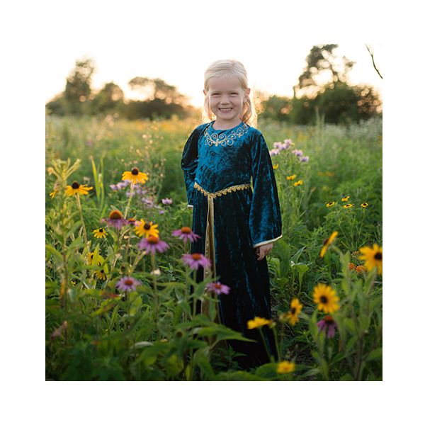 Vestido infantil de Dama Ginebra en un elegante tono turquesa, inspirado en la realeza medieval y los relatos de castillos y fantasía. Su silueta larga, las mangas acampanadas y los detalles dorados crean un look noble y atemporal, perfecto para juego simbólico, disfraces históricos, teatro o celebraciones especiales. Una prenda pensada para imaginar, interpretar y jugar durante horas.