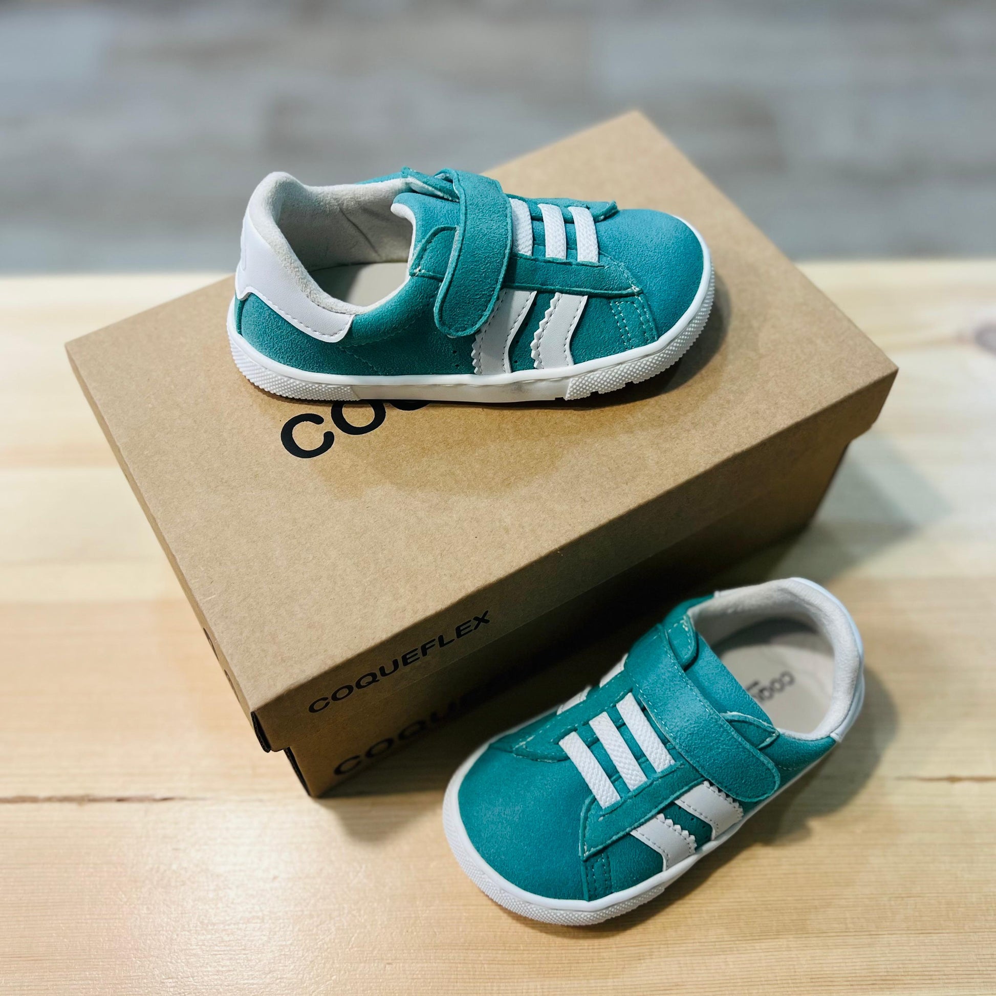Las zapatillas barefoot Suede Micropelle Laguna Blanco de Coqueflex están pensadas para respetar el desarrollo natural del pie infantil. Con un diseño urbano en verde laguna y detalles blancos, ofrecen libertad de movimiento, comodidad y estilo en cada paso.